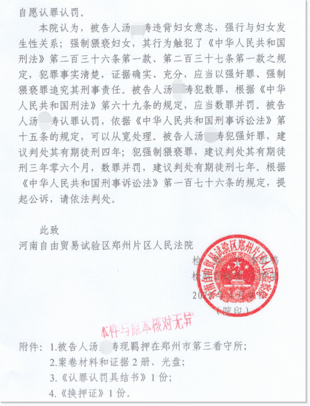 “起诉书中,由于汤某涛认罪认罚,检方认为可以从宽处理。汤某涛犯强奸罪,建议判处有期徒刑四年;犯强制猥亵罪,建议判处有期徒刑三年零六个月,数罪并罚,建议判处有期徒刑七年。”