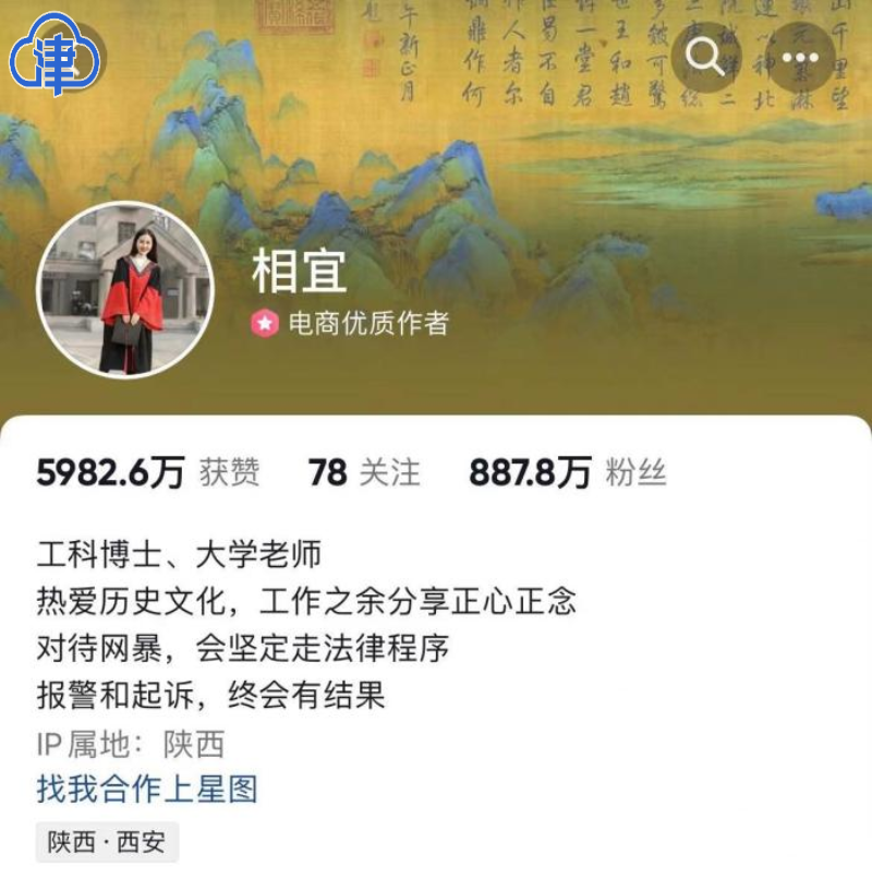“相宜”的账号介绍中显示:“工科博士、大学老师,热爱历史文化,工作之余分享正心正念,对待网暴会坚定走法律程序,报警和起诉,终会有结果。”