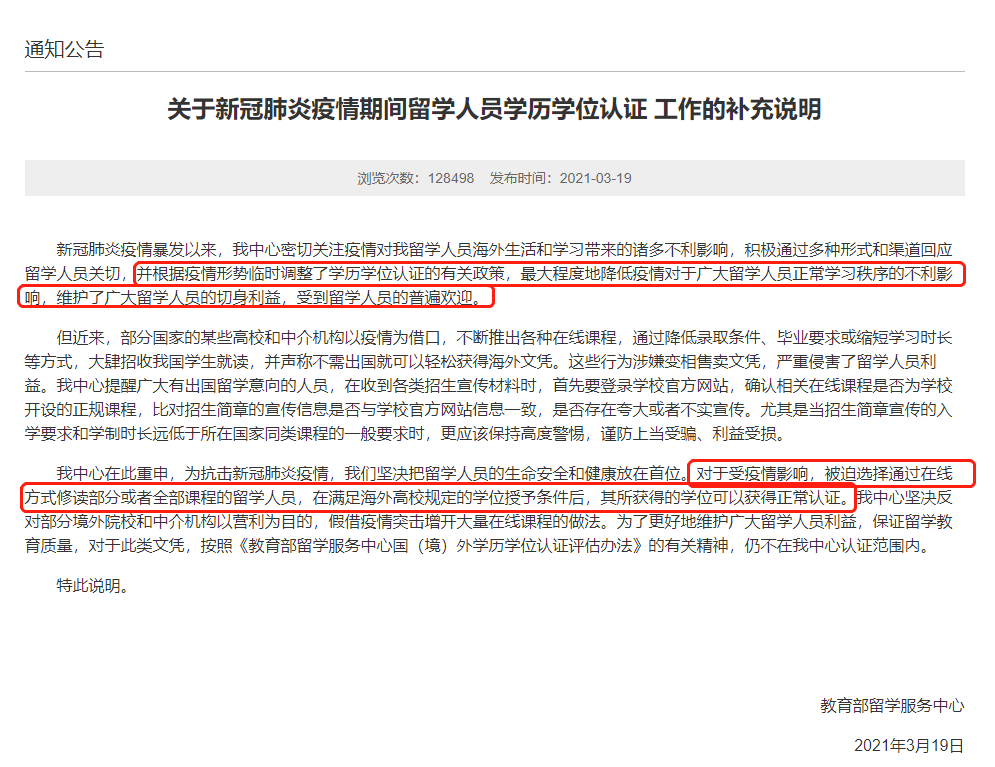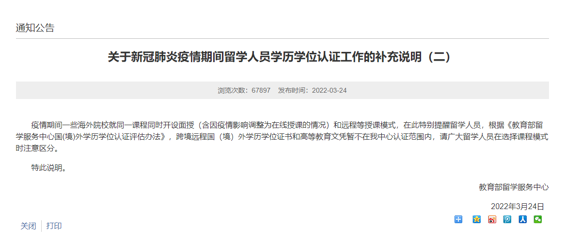 二、中国学生所就读的该国大学专业课程为全日制授课模式,而非线上授课模式。但受疫情影响,被迫选择通过在线方式修读部分或者全部课程的留学人员,在满足海外高校规定的学位授予条件后,其所获得的学位可以获得正常认证。