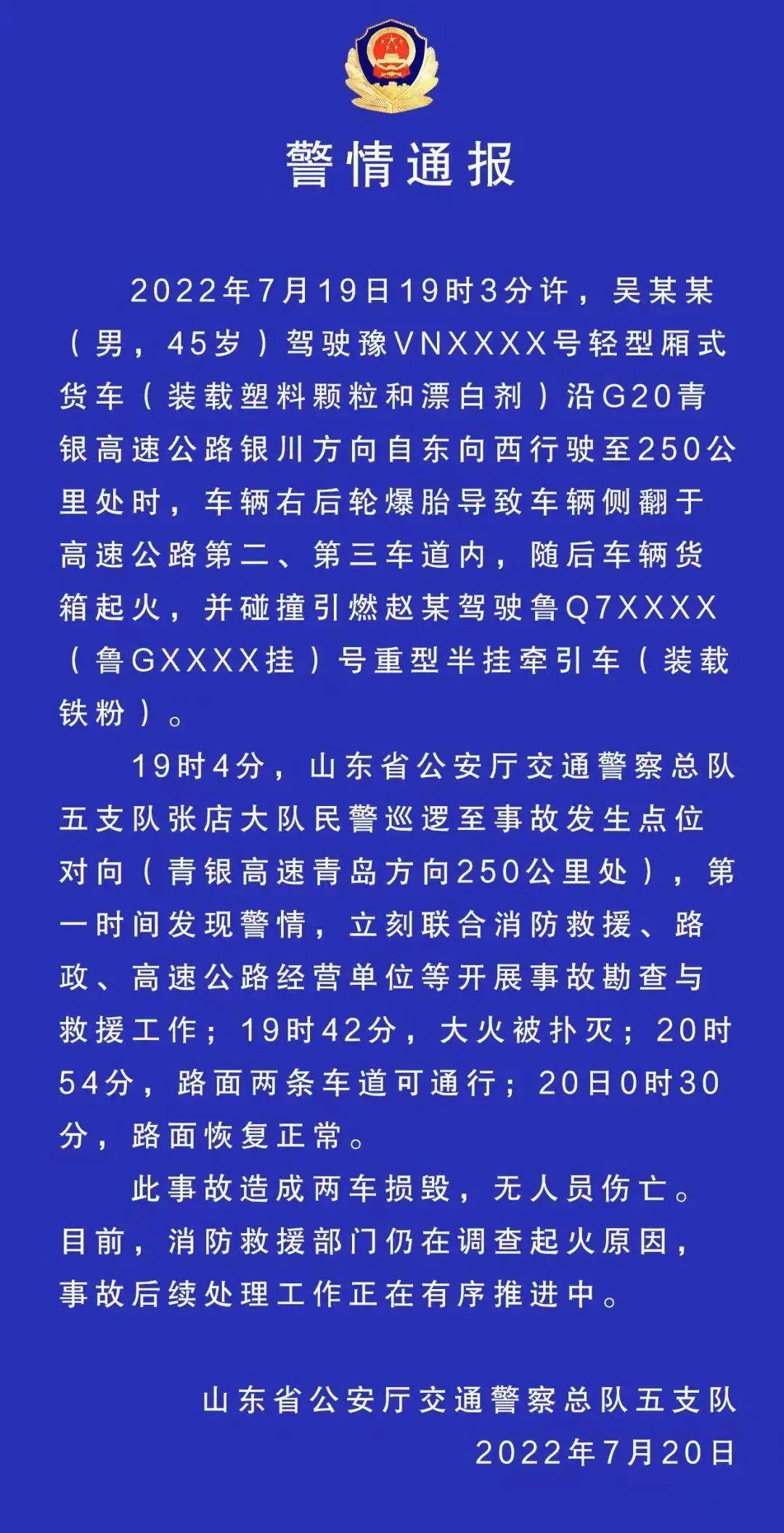 山东淄博一货车发生爆燃起火 无人员伤亡