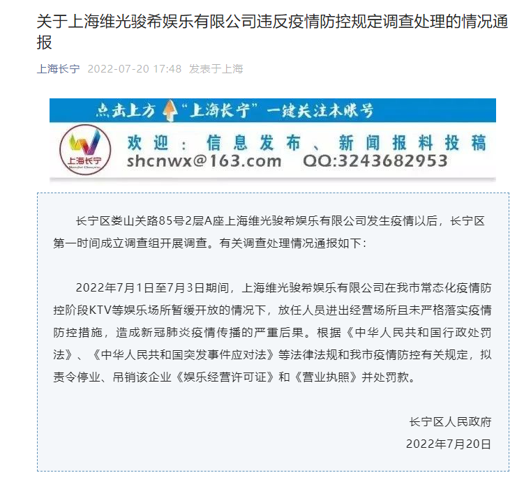 “上海长宁”微信公众号20日消息,长宁区人民政府通报,2022年7月1日至7月3日期间,上海维光骏希娱乐有限公司在上海市常态化疫情防控阶段KTV等娱乐场所暂缓开放的情况下,放任人员进出经营场所且未严格落实疫情防控措施,造成新冠肺炎疫情传播的严重后果。根据《中华人民共和国行政处罚法》《中华人民共和国突发事件应对法》等法律法规和上海市疫情防控有关规定,拟责令停业、吊销该企业《娱乐经营许可证》和《营业执照》并处罚款。