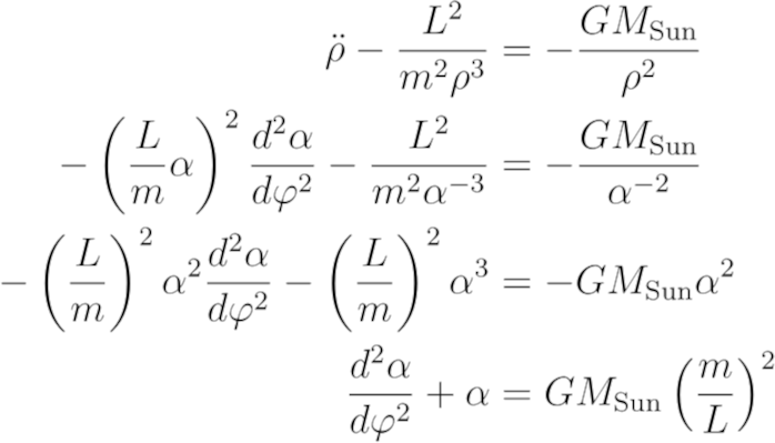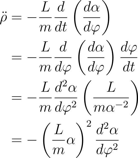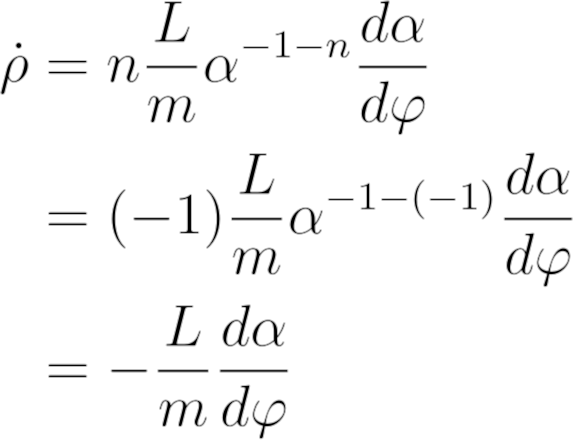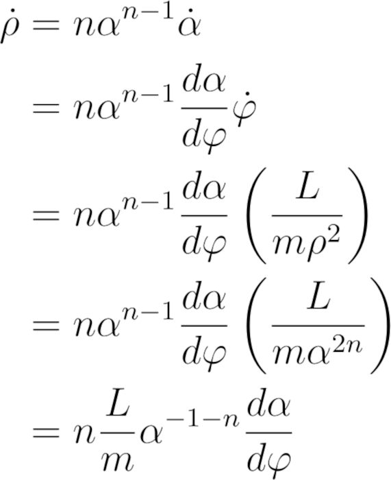 正如你所看到的,有一个导数的平方,它阻止了我们求出闭合解。我们还没有设n的值,所以看看是否可以将它设为某个值,以去掉平方导数。如果n = 0或n = 1,就可以消去平方导数,但也会把有用的东西消去。我们注意到平方导数来自于一阶导数中的α项,所以看看能不能去掉它。我们用链式法则把dα/dt写成(dα/dφ) (dφ/dt)。从角方程,我们知道dφ/dt = L/(m ρ^2),从α的定义,有
