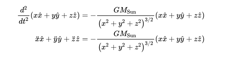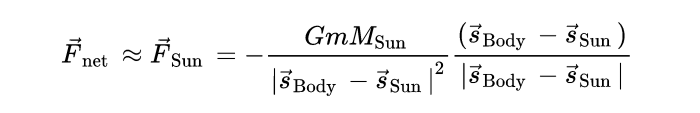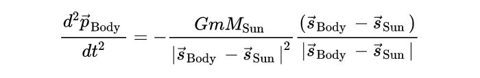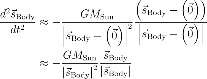 至此,我们已经知道了运动方程,但还可以做一些简化。首先,注意到太阳比太阳系中任何其他物体的质量都大得多。根据牛顿第三定律,尽管两个物体受到的力是相同的,但太阳的移动要比其它物体小得多。这样,我们可以将坐标系统的原点设置在太阳的中心,这意味着太阳的位置是零矢量: