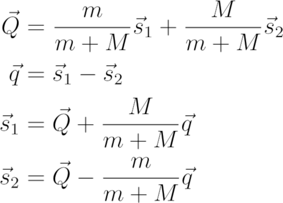 我们称Q为质心。一组没有外力的物体的质心将以恒定的速度运动。我们可以通过解线性方程组,找到用这两个新量表示的原始轨迹。