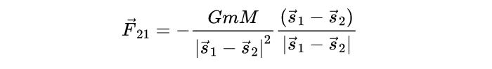 其中F_21是第一个物体对第二个物体的作用力,G是常量,m_1和m_2是两个物体的质量,s_1和s_2是两个物体的位置,|s_1- s_2|是两个物体之间的距离。从数学上讲,s_1- s_2表示从第二个物体的位置到第一个物体的矢量,矢量的大小用绝对值表示。这个表达式看起来很奇怪,因为分母是距离的3次方。但是分子式中的s_1- s_2也是距离单位。对于作用在一个物体上的总力,我们可以把每一个物体对第一个物体施加的力加起来。