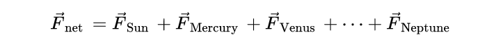 如果代入一些数字,会发现可以忽略除太阳以外的所有项。例如,太阳对地球施加的力是月球对地球施加的力的177倍。木星对土星施加的力,是除太阳以外的任何两个物体之间最强的力,它只占土星和太阳之间力的0.5%左右。