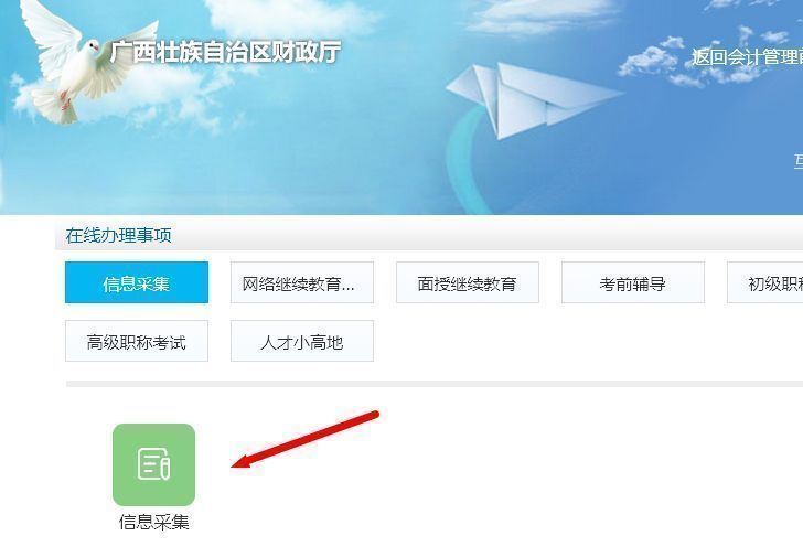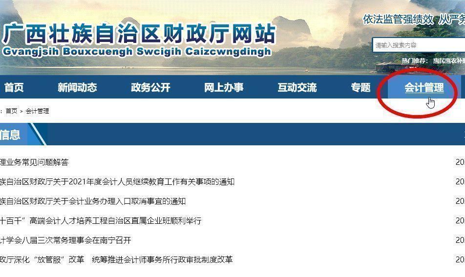 会计人员信息采集入口为“广西壮族自治区财政厅”网站,进入后在菜单中点击“会计管理”