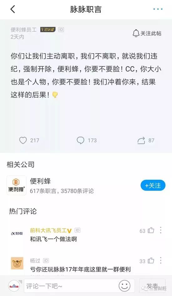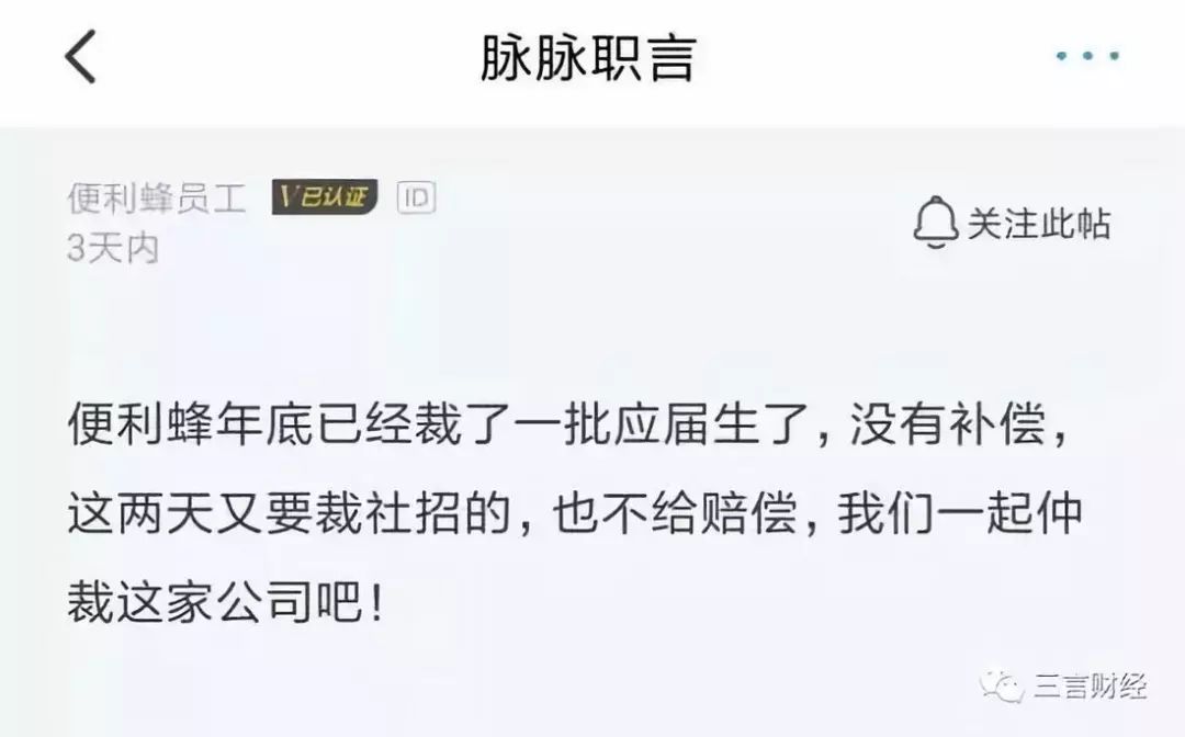 有员工表示,便利蜂年底已经裁了一批应届生了,没有补偿,这两天又要裁社招的,也不给补偿。