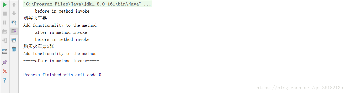 public class ProxyTest { public static void main(String[] args) { //接口实现类 TicketProvider ticketProvider = new TicketProviderImpl(); //InvocationHandler实现类,用到了刚才定义的构造器 InvocationHandler handler = new TicketProviderProxy(ticketProvider); //newProxyInstance()生成动态代理类实例,args[0]是实现类,args[1]是要接口类, //args[2]是InvocationHandler实现类,即处理器,处理传入的需要被代理的真实对象 TicketProvider ticketProviderProxy = (TicketProvider) Proxy.newProxyInstance( ticketProvider.getClass().getClassLoader(), ticketProvider.getClass().getInterfaces(), handler); //传入参数测试 ticketProviderProxy.getTrainTicket(); ticketProviderProxy.getTrainTicket(5); }}可以看到输出结果是