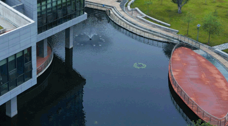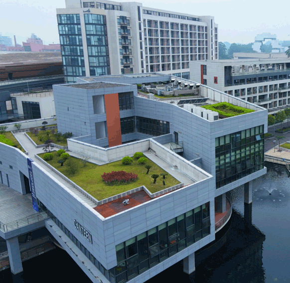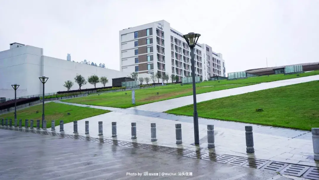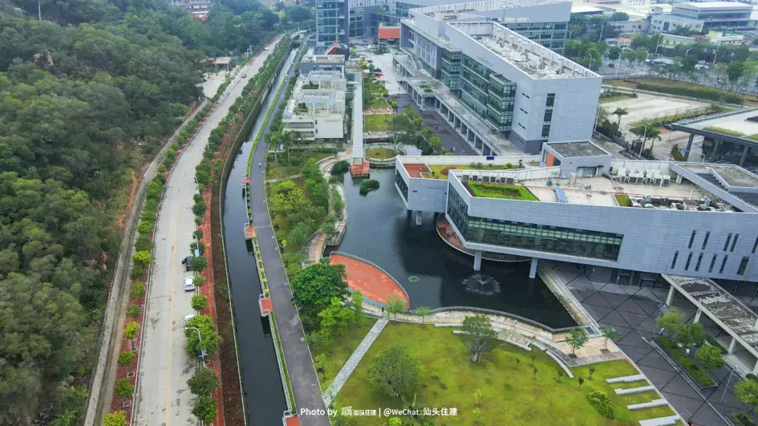 广东以色列理工学院北校区布设有绿色屋顶、透水铺装、下凹绿地及调蓄池等海绵设施,充分体现了海绵城市建设“渗、滞、蓄、净、用、排”的理念。