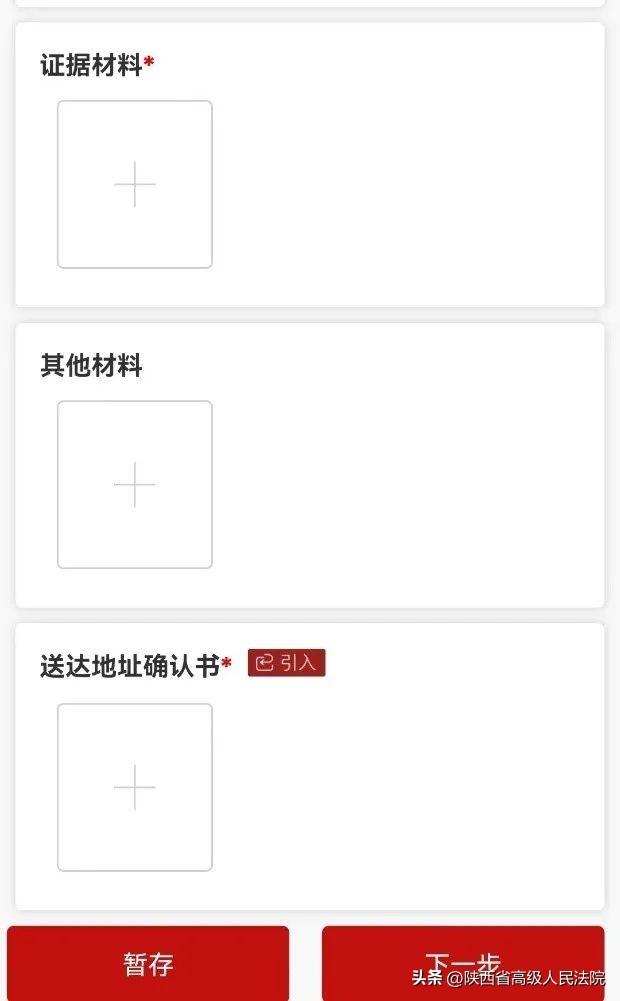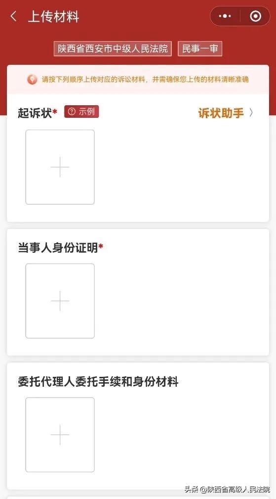 第四步:根据提示上传相关材料(带有红色星号的为必填项),需要上传的材料参考线下立案的材料清单。全部填写完毕后点击提交,就完成立案申请啦。