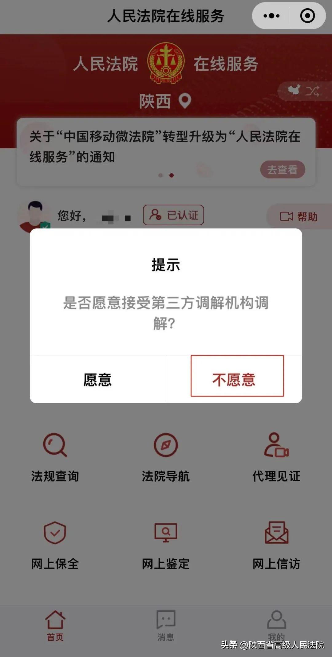 第二步:登录后点击“我要立案”,选择“审判立案”(如果是执行立案则点击执行立案)、在提示弹窗“是否愿意接受第三方调解机构调解”中选择“不愿意”后进入网上立案界面