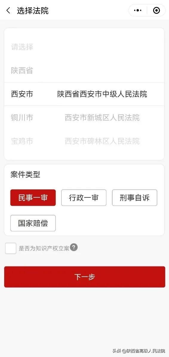 第三步:在立案界面点击“审判立案”,在确定申请人身份后选择西安市中级人民法院及【民事一审】案件类型,勾选是否属于知识产权类案件,阅读《立案须知》,勾选已阅读并同意,进入上传材料页面。