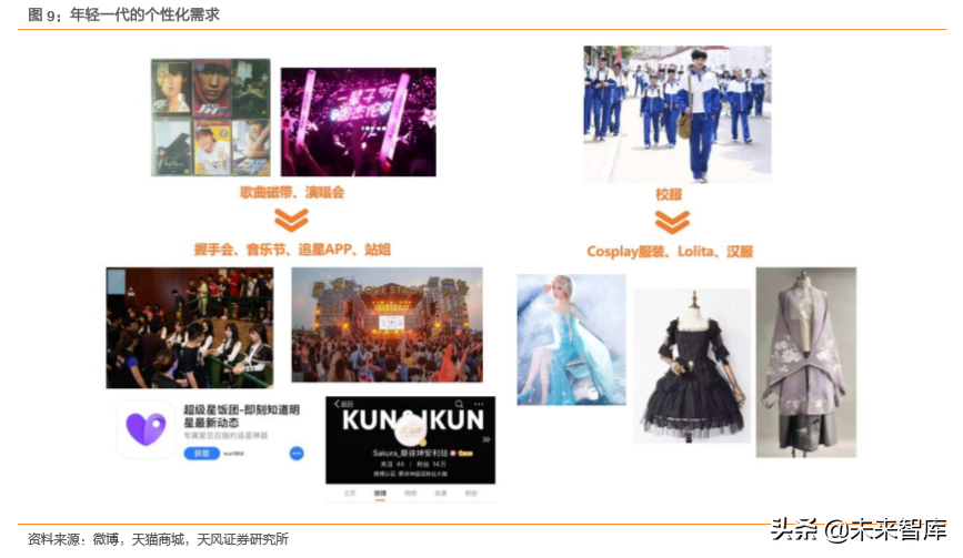 以二次元为例,根据 Mob 研究院今年发布的《85、95、00 后人群洞察白皮书》,00 后线上阅读中动漫的 TGI 指数远高于 85 后及 95 后,以二次元为起点衍生出了许多目前相对小众的消费需求,诸如周边手办、cosplay 等。结合着前面提到的年青一代消费能力提升,一个有一定规模的细分市场就这样产生了。