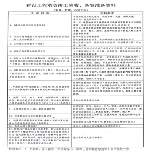 特别注意:消防验收资料至少要在交楼前40天要收集齐全并提交公安消防机构受理。从资料受理到取得消防合格意见书至少需要30天时间,所以要提前准备资料,不能因资料滞后而影响消防验收。