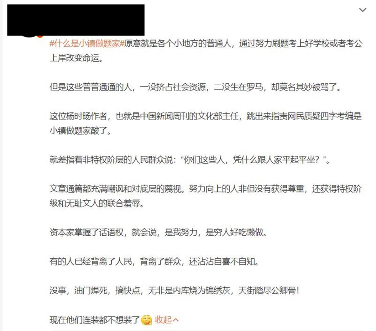 因为这位作家在文中把所有质疑的人都比做成了“小镇做题家”,说这些人努力半天考不上,就嫉妒别人。
