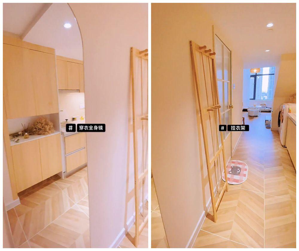而走廊过道的左手边,用拱形的穿衣镜打造出了一个换衣区,前面的挂衣架也可以收纳几件常穿的衣物和裤子,穿衣换衣都很方便。