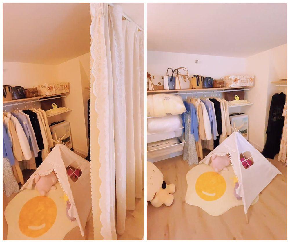 靠近墙面的一侧,利用最后一点空间做了一个半开放式衣帽间,同样用布帘进行分区和遮挡,满足这位姑娘拥有衣帽间的小小愿望,到这里,我们就参观完这个小家啦~