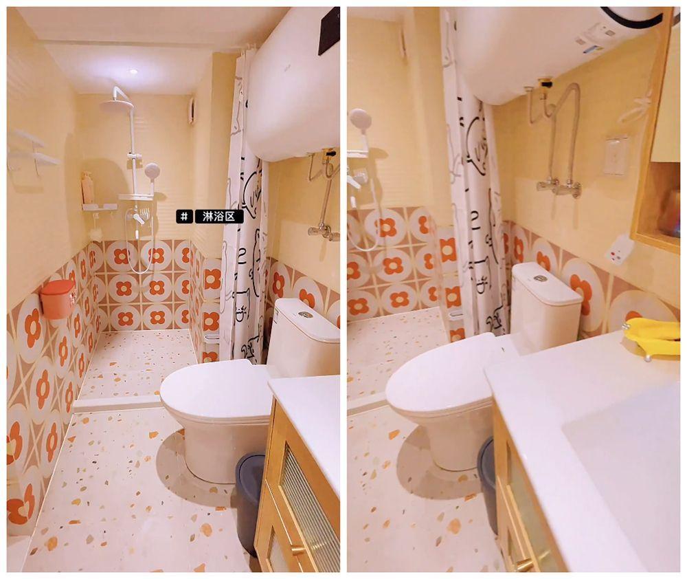 而往里走去,是家里的马桶和沐浴区,水磨石的地板和花朵图案的瓷砖腰线,让卫生间带给人一种清新、可爱的少女氛围,看起来很漂亮。
