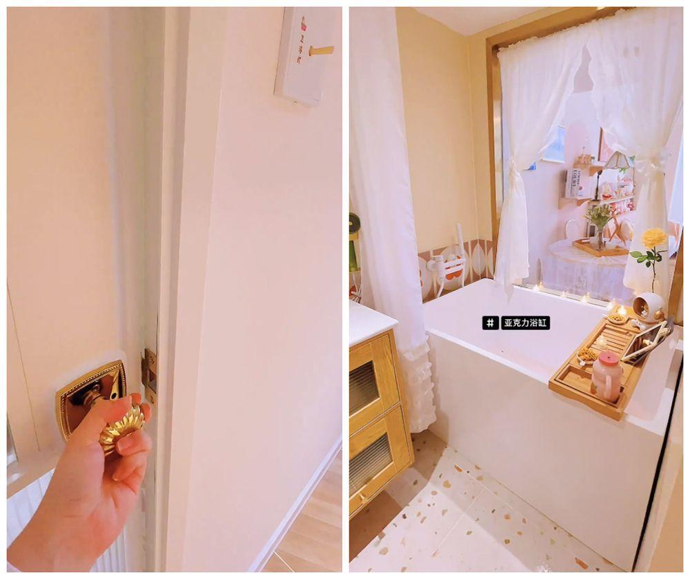推开厨房正对面的这扇门,发现里面是家里的卫生间,对于很多这类的小户型来说,卫生间的面积可以说算很宽敞了,紧靠入门右手边的,是一个较大的亚克力浴缸,与客厅用玻璃窗进行隔断,起到封闭作用的同时,也实现了优秀的采光。