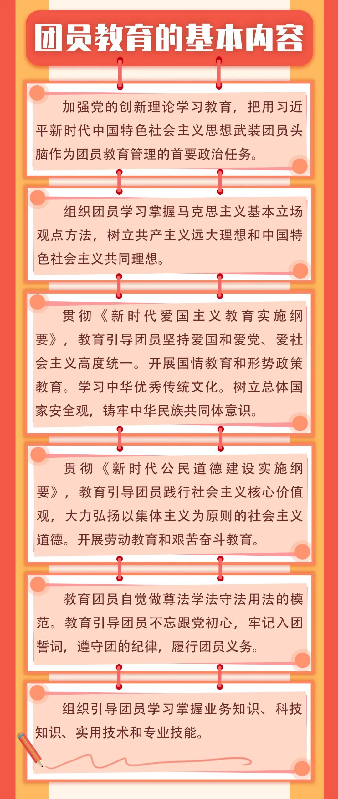 组织团员学习团章和中国青年运动史、团史,教育引导团员不忘跟党初心,牢记入团誓词,遵守团的纪律,履行团员义务,培养团员的归属感、光荣感,激励团员在学习工作及其他社会生活中发挥模范作用。