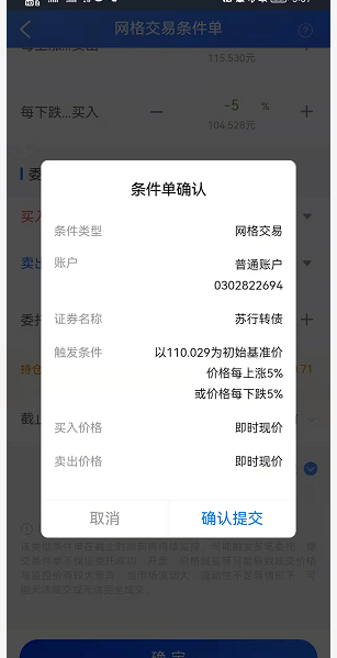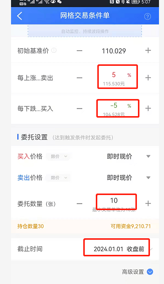 3.设置相关的条件,我的策略是上涨5%卖10张,下跌5%买10张