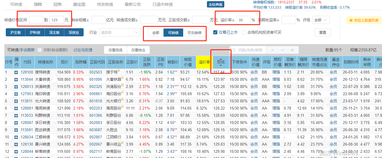第二步:价格小于125且溢价率小于30%,并进行双低排序,如果本金多可以选择前20名,本金不多,选择前10名。