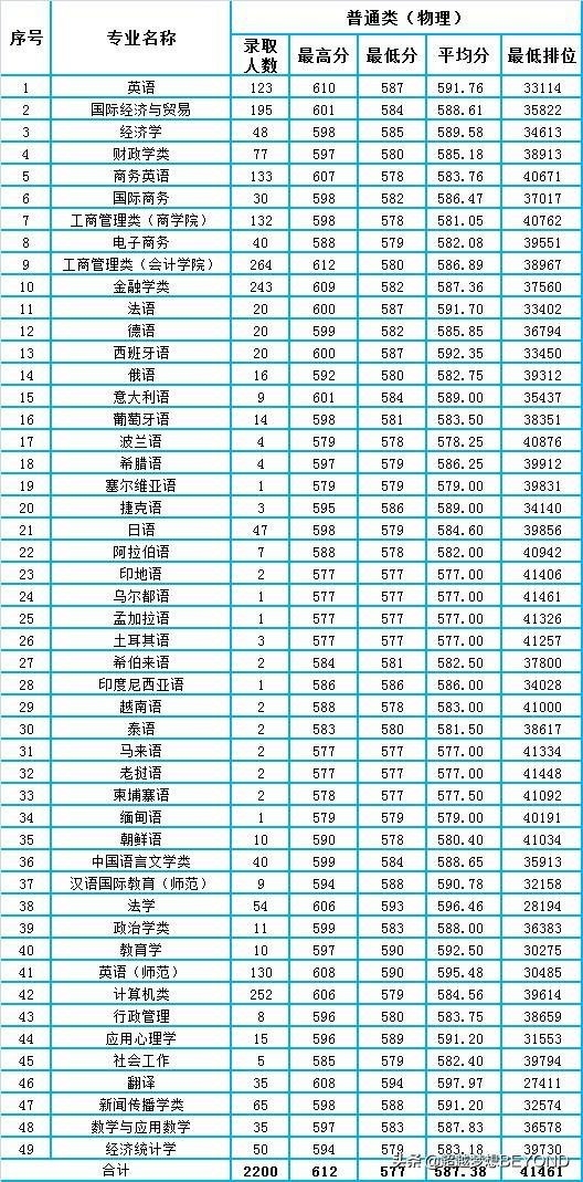 物理类专业录取最高分是来自工商管理类(会计学院)的612分,录取最低分577分,录取平均分587.38,最低排位41461,详见下表。