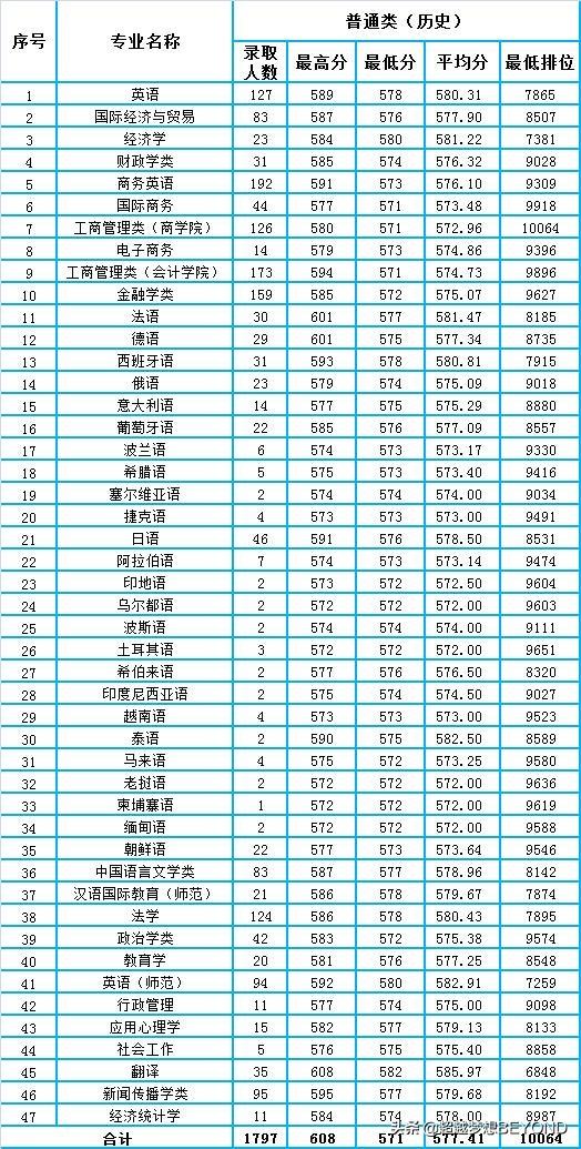 历史类专业录取最高分608分(翻译专业)、录取最低分571分,录取平均分577.41,最低排位10064,详见下表。