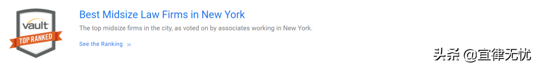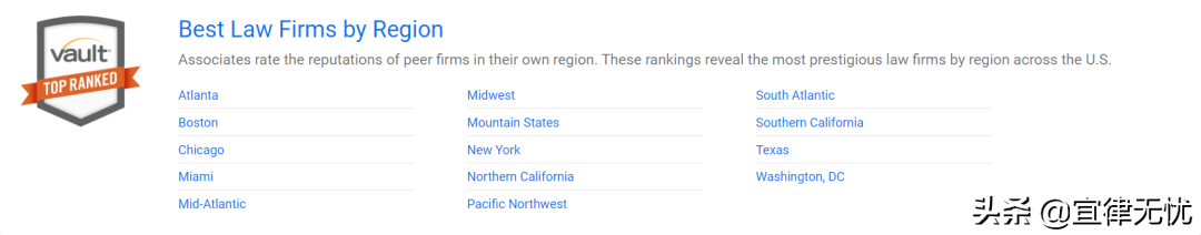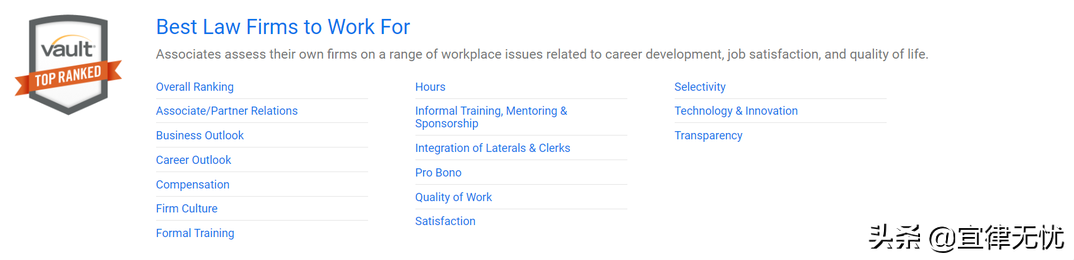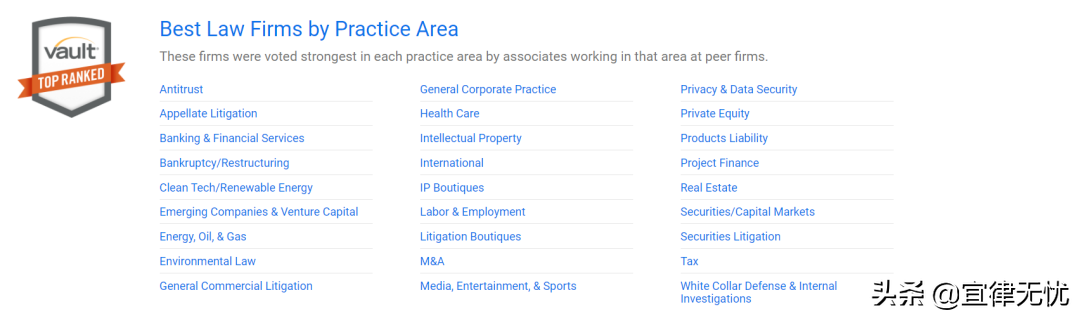 在法律领域,Vault定期发布Vault Law 100、Best Law Firms to Work For等九大榜单。