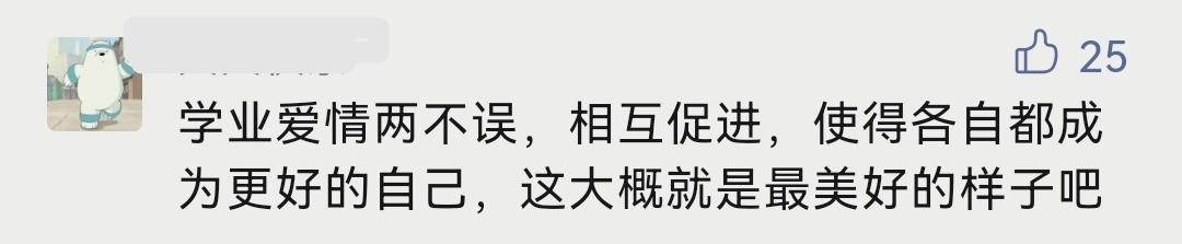 “学位爱情两不误,相互促进,使得各自都成为更好的自己,这大概就是最美好的样子”。