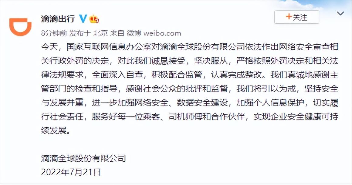 今天,国家互联网信息办公室对滴滴全球股份有限公司依法作出网络安全审查相关行政处罚的决定,对此我们诚恳接受,坚决服从,严格按照处罚决定和相关法律法规要求,全面深入自查,积极配合监管,认真完成整改。我们真诚地感谢主管部门的检查和指导,感谢社会公众的批评和监督,我们将引以为戒,坚持安全与发展并重,进一步加强网络安全、数据安全建设,加强个人信息保护,切实履行社会责任,服务好每一位乘客、司机师傅和合作伙伴,实现企业安全健康可持续发展。