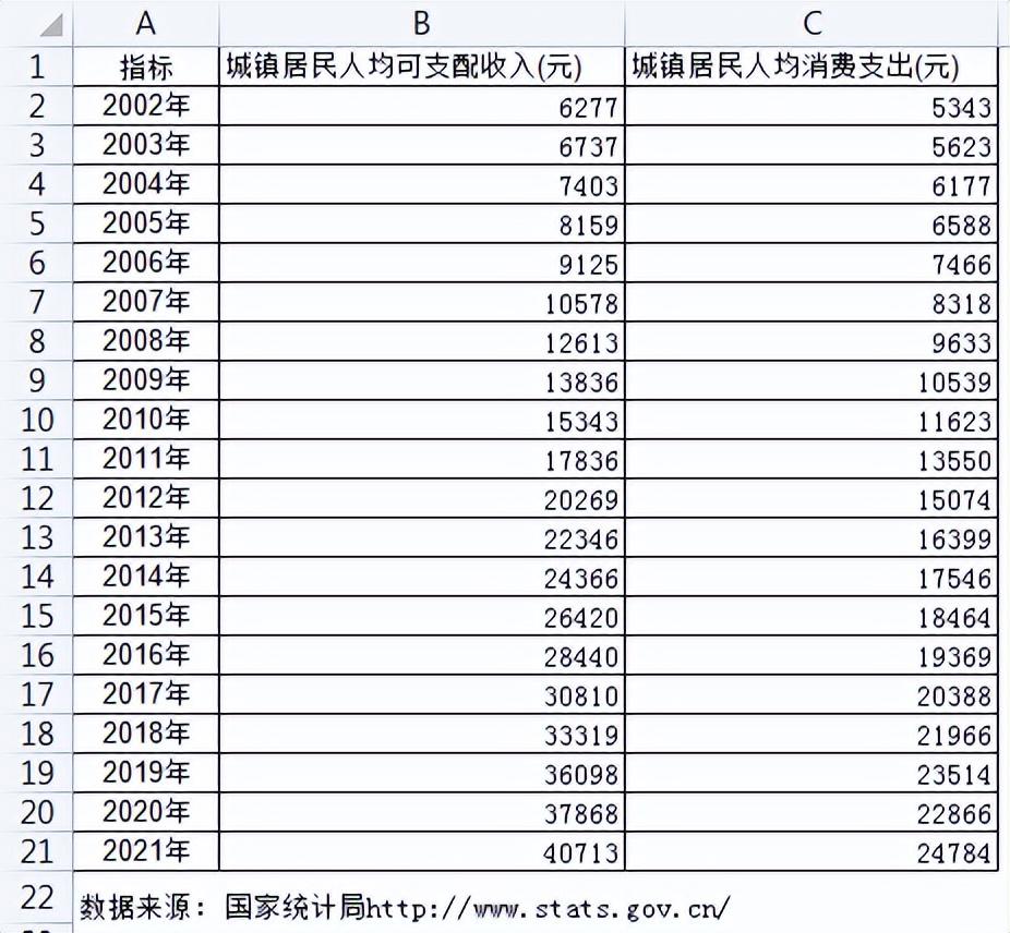 陕西省2002年到2021年城镇居民人均可支配收入与支出数据。具体数据如下表所示。