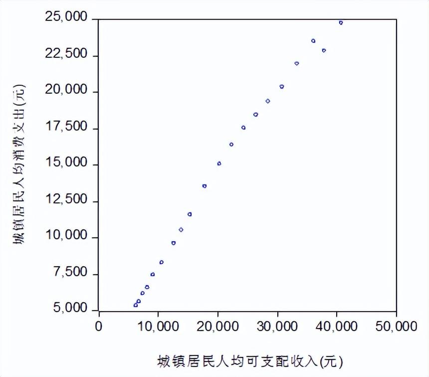 (1)城镇居民人均消费支出y与可支配收入x之间是否线性相关:画图,求解x与y之间的相关系数