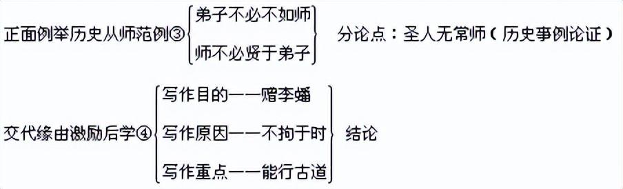 第二层:用孔子的言和行两方面的事例论证。作者举出孔子询官于郯子,访乐于苌弘,学琴于师襄,问礼于老聃的事例。孔子言论中的“三”,应理解实指三人:一个自己,一个善者,一个不善者,而“我”却能从其善,改其不善。这样解释才能体现格言的警辟性。最后作者从孔子的事例中推断出:“弟子不必不如师,术业有专攻”的结论。