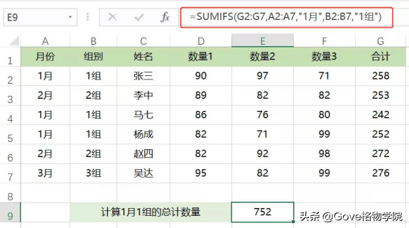 【例】:求下面的1月1组的数量总计,在E9单元格中输入公式: