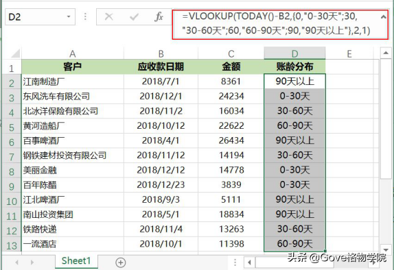 =VLOOKUP(TODAY-B2,{0,"0-30天";30,"30-60天";60,"60-90天";90,"90天以上"},2,1),按Enter键后向下填充。如下图所示: