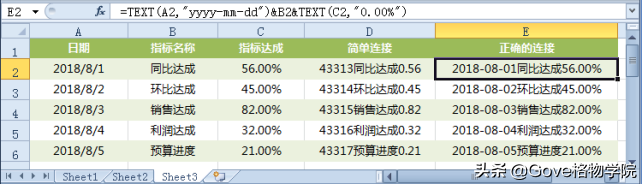 要求:下面为日期与文本进行连接。E2单元格输入公式为(&表示连接):=TEXT(A2,"yyyy-mm-dd")&B2&TEXT(C2,"0.00%")