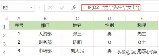 说明:在Excel中引用文本的时候一定要使用英文状态下的半角双引号。以上公式判断D2如果是男,则返回先生,否则那一定就是女,返回女士。