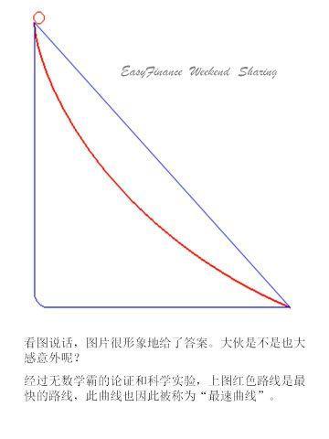 意大利科学家伽利略,在1630年提出:“一个质点在重力作用下,从一个给定点到不在它垂直下方的另一点,如果不计摩擦力,问沿着什么曲线滑下所需时间最短。”最后证明,两点间最快的路线并不是直线,而是一段旋轮线,这条就是有名的“最速曲线”。