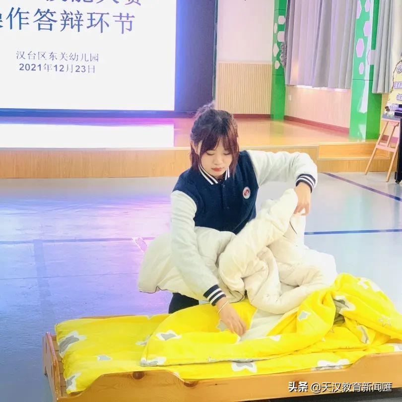 叠被子比赛中,保育老师用灵巧的手,在规定时间内套被套,整理床铺,平整的被子显示了保育老师的专业精神。