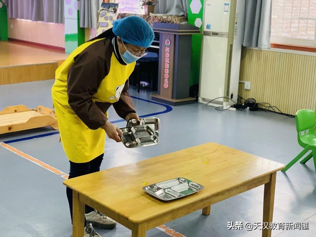 保育老师们对桌面进行全方面消毒后,开始快速合理的分餐并介绍餐食名称及营养知识,她们娴熟的动作是往日实践积累的的经验。