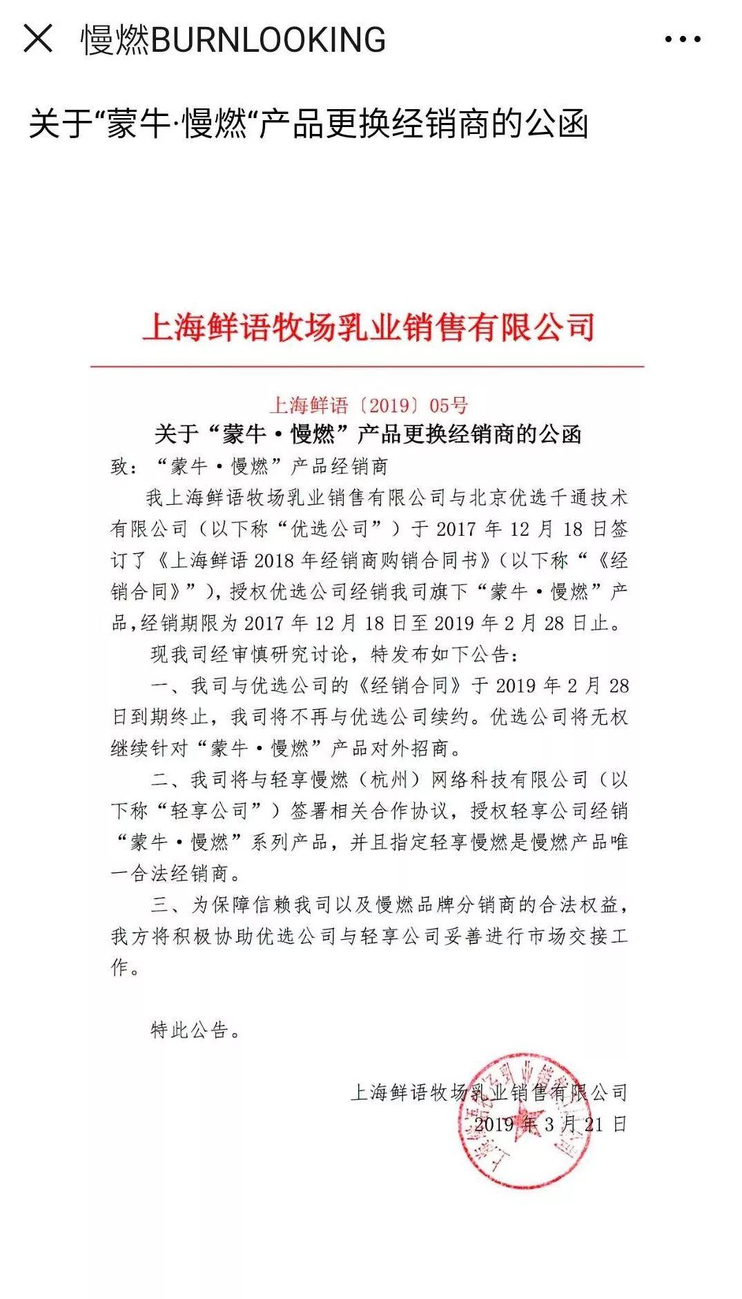 3月21日,慢燃新官方微信发布《关于“蒙牛·慢燃”产品更换经销商的公函》,称上海鲜语牧场乳业销售有限公司与优选千通合同终止后不再续约,优选千通无权继续针对慢燃产品对外招商。上海鲜语已与轻享慢燃(杭州)网络科技有限公司签署合作协议,并指定轻享公司为慢燃产品唯一合法经销商。同时,上海鲜语“将积极协助优选千通与轻享公司妥善进行市场交接工作”。