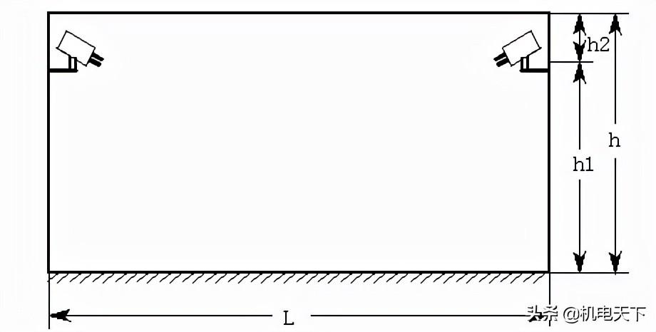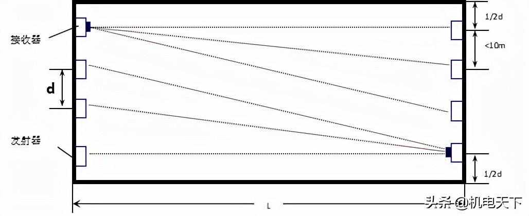 图中所示相邻两只发射器间的水平距离d不应大于10m。超过这一距离,探测器灵敏度受到影响。发射器轴线距侧墙的距离不应小于0.3m,以便于探测器的安装维护,根据现场实际情况可选定图中d和L(两相对墙壁之间的距离)的尺寸,应符合上述规定。