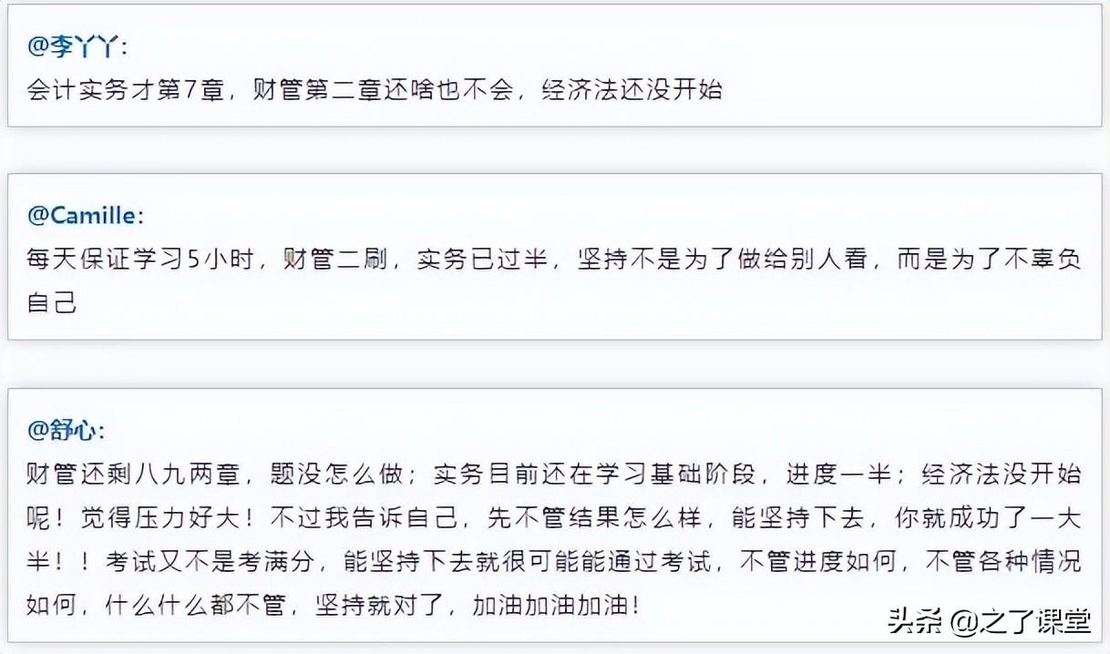 可以看到,大部分同学是报了3科,目前只学习了实务和财管这两科,经济法还没开始。