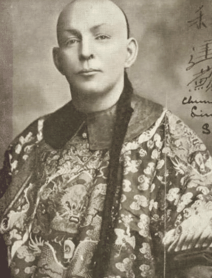 为了让自己更像一个中美混血儿,他买了一条假辫子,戴在头上;定做了一套龙袍,穿在身上;还花钱雇了一个“小脚”女子,冒充自己的中国媳妇。