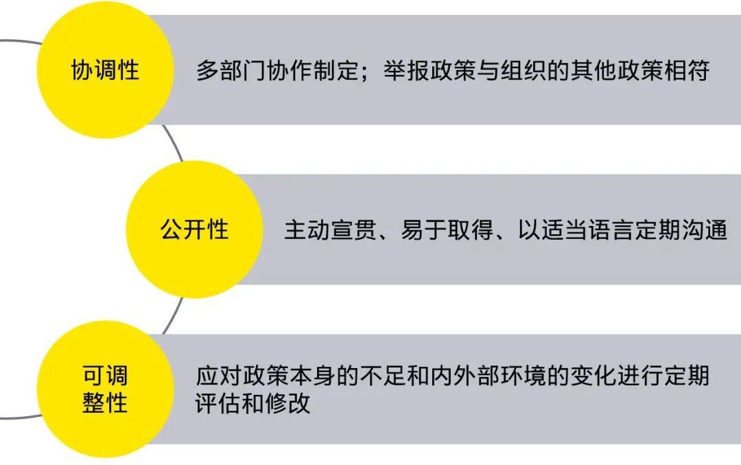 举报政策是整个举报管理系统中的纲领性文件。一项理想的举报政策应当具有协调性、公开性和可调整性: