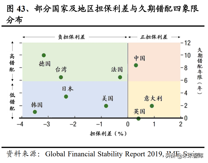 投资利差方面,主要发达市场,整体差异并不大,而综合考虑担保利差与久期错配情况各国情况表现各异。站在投资端看利差水平,中、美、日、韩 2016-2020 年投资利差均值在 151BP-232BP 区间波动,各市场差距不大,且近年趋势趋于稳 定。换一角度,结合久期匹配情况来观察负债成本压力,根据 2019 年全球金融稳 定报告数据,意大利、英国在维持正担保利差的同时较好地兼顾了资产与负债端 久期的匹配,美、日、韩与中国分别保证了期限匹配与担保利差水平其中之一, 而德、法、台则处于高错配与负利差的双重困境当中。