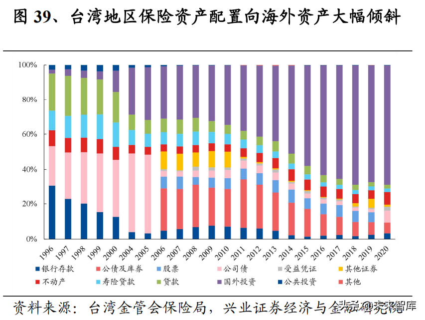 中国台湾以海外投资为主的应对策略与自身债券 市场供给不足有一定关系,监管层为放开险资海外投资,一度规定保险业投资国 际板债券可不计入国外投资,之后考虑控制汇率风险,设定国际板也需要加计入 海外投资,最高不得超过可运用保险资金的 65.25%。在监管积极支持的背景下, 中国台湾地区保险行业海外资产配置占比从 1996 年的 2.2%大幅扩张至 2020 年的 64.86%,且在实际计量口径中,寿险公司投资的部分以新台币计价的基金底层资 产也为海外证券,实际比例应更高。由于权益投资比例未有较大变动,可推断台 湾地区在海外投资类别上依然倾向固收类资产。