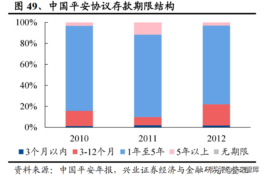高收益、中等期限债券成为该阶段保险公司主流配置。由于该阶段我国保险公司 债券投资占总投资资产比重较高,具体拆分债券资产结构,收益率较高的企业债 占比在 30%-40%左右,占比较高;定期存款期限方面,2010-2012 年以 3-5 年期 限的为主,其中国寿、新华 2012 年占比均达到 48%、61%。5 年以上期限资产配 置整体缺失。